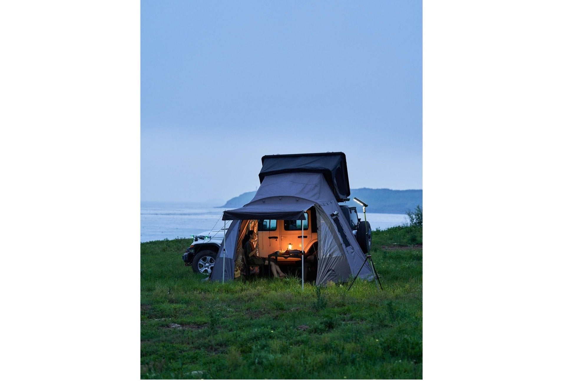 Das Wild Land Annex B ist ein einfach aufbaubares Vorzelt für die Autodachzelte Wild Cruiser 250, Z-Shape und Normandy Auto 140. Es kann mit der Wild Land Dachzelttraufe kombiniert werden, um zusätzlichen Lebensraum für Outdoor-Camping zu schaffen. Die silberne Beschichtung sorgt für eine hohe UV-Beständigkeit. Das robuste 210D Rip-Stop-Gewebe macht es stabil und langlebig. Camping-Enthusiasten, Overlander, Wanderer und erfahrene Off-Roader wissen, wie komfortabel und wichtig ein zusätzlicher Raum in der freien Natur sein kann. Dieser Anbau ist riesig und bietet nicht nur Platz zum Umziehen oder zum Verstauen von Taschen und anderer Ausrüstung, sondern wird auch zum Wohnzimmer. Stellen Sie einfach Ihr Zelt auf, befestigen Sie das Vorzelt, und schon haben Sie einen riesigen Wohnbereich, in dem Sie sich hinsetzen, essen, etwas trinken oder einfach die Aussicht genießen können, während Sie vor der brennenden Sonne oder dem strömenden Regen geschützt sind. Wenn Sie drinnen sitzen, werden Sie spüren, wie schön und großartig Camping sein kann. Es bietet nicht nur einen persönlichen Schutz, sondern ist auch ein zusätzlicher Raum für Ihre Campingfreizeit. Im wahrsten Sinne des Wortes, einer der besten Vorzelte auf dem Markt, ein einzigartiges Produkt, das Wild Land wieder einmal charakterisiert und von den anderen unterscheidet!