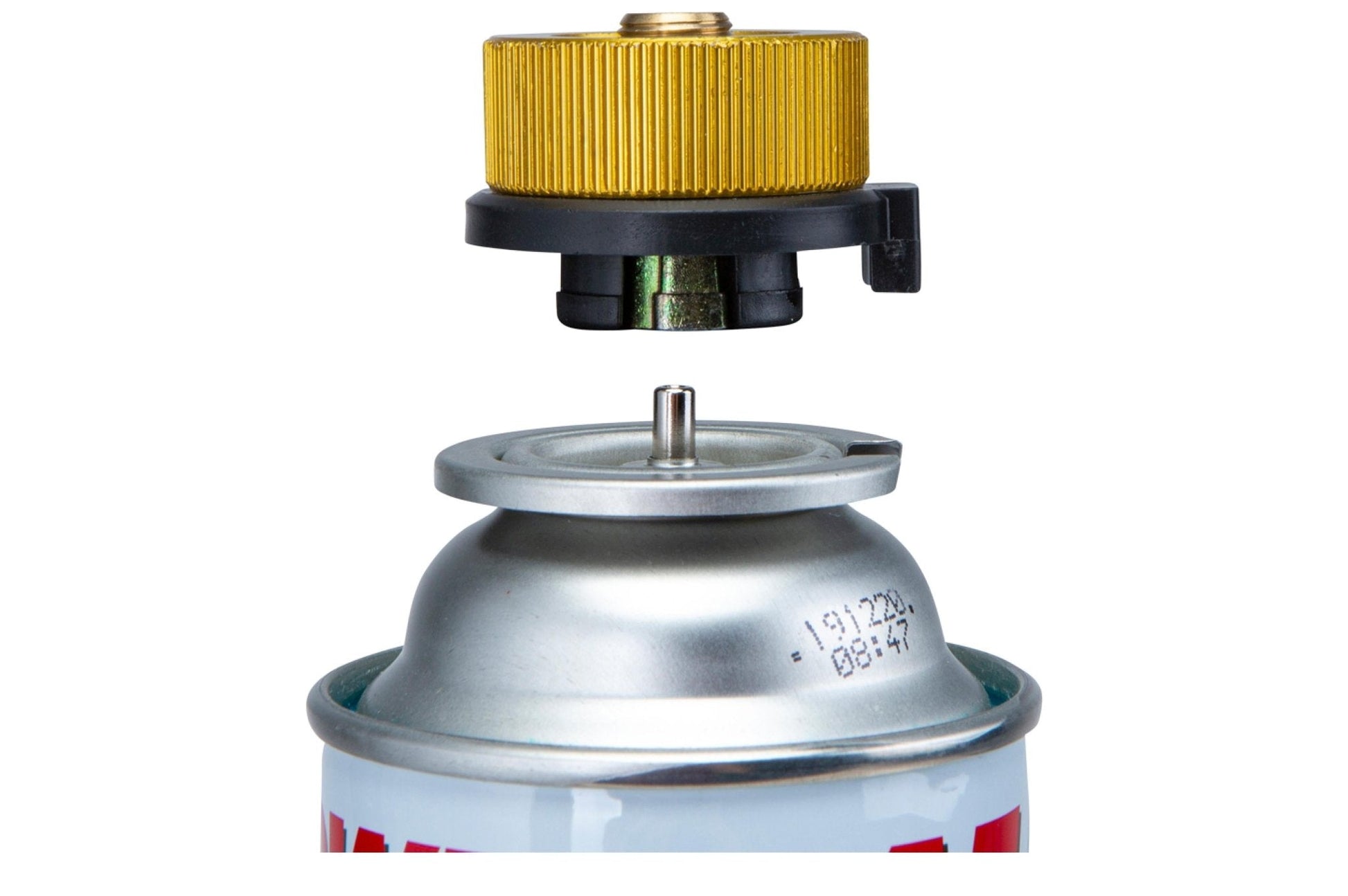 Sehr praktischer Adapter zur Verwendung der weit verbreiteten 227g-Gaskartuschen als Gewindegaskartuschen.