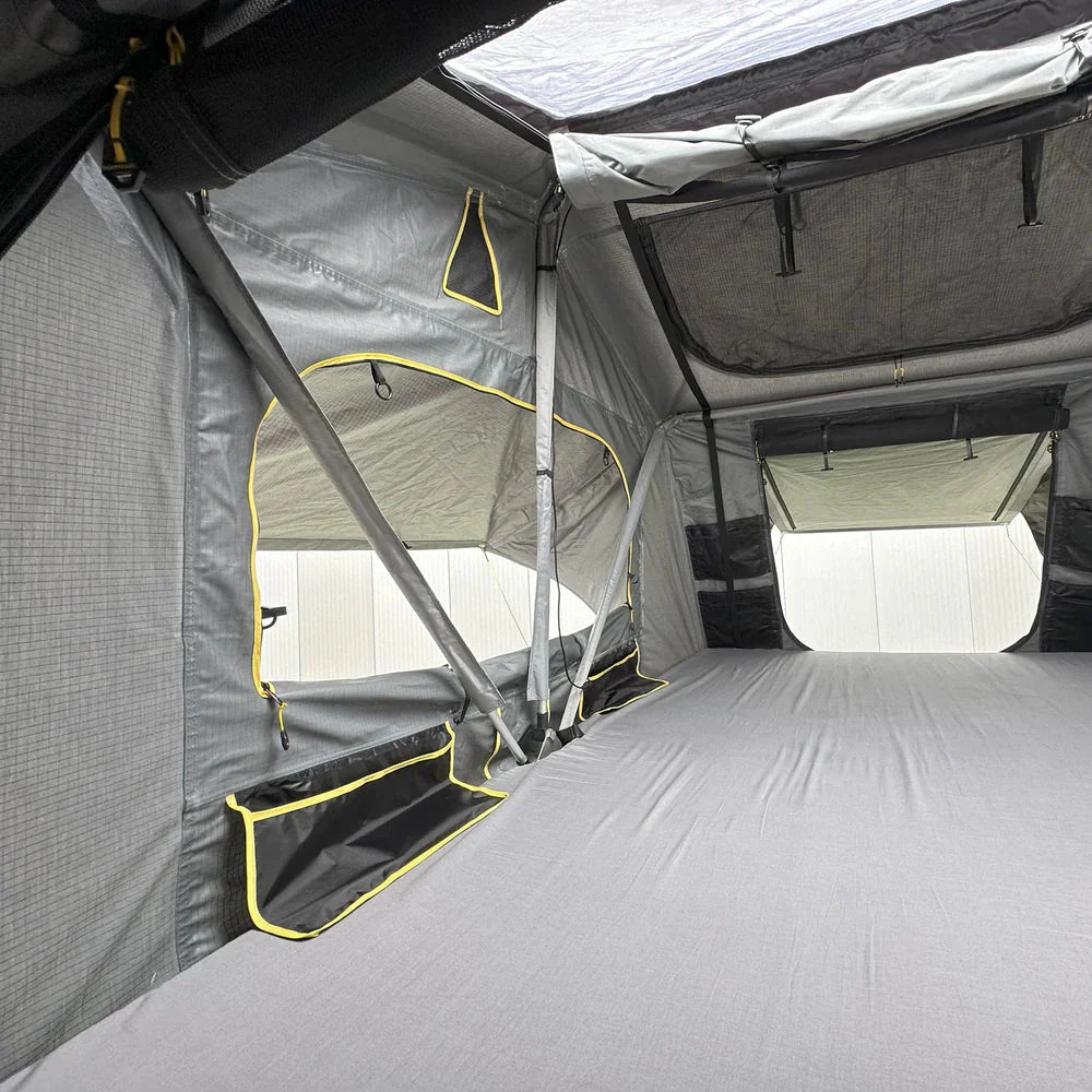 Der Eingang, die Seitenfenster und die zwei Dachfenster sind mit Mückennetzen ausgestattet und können alternativ auch komplett geschlossen werden. Zusätzlich verfügt der Innenraum des Dachzelts über 12 Seitentaschen für genügend Stauraum. Eine praktische Schuhtasche (zwei für das 220 cm Dachzelt) ist ebenfalls im Lieferumfang enthalten, um keinen Dreck mit ins Dachzelt zu ziehen.