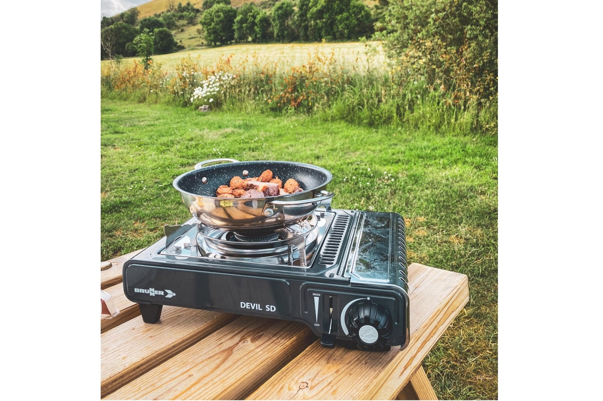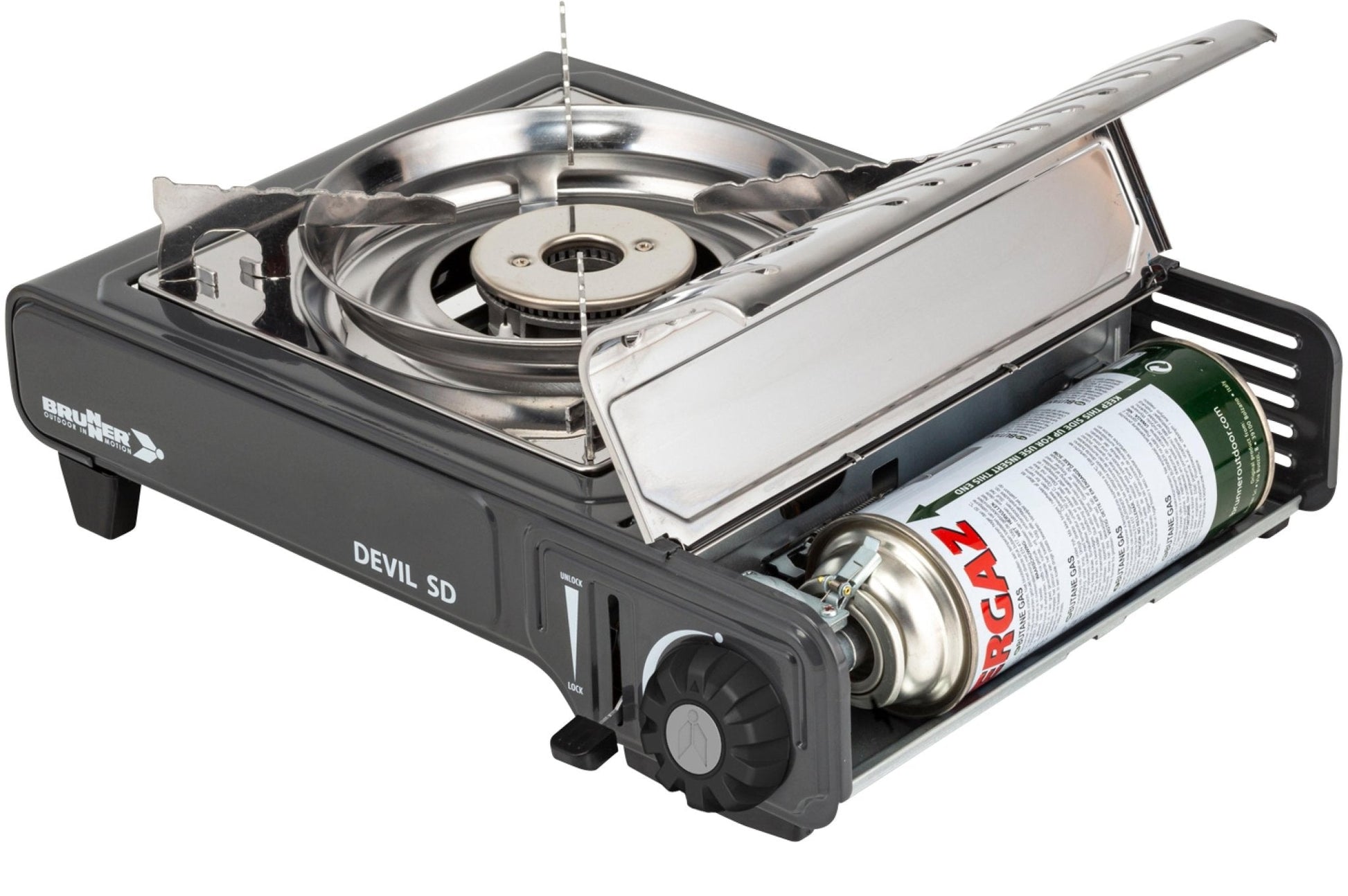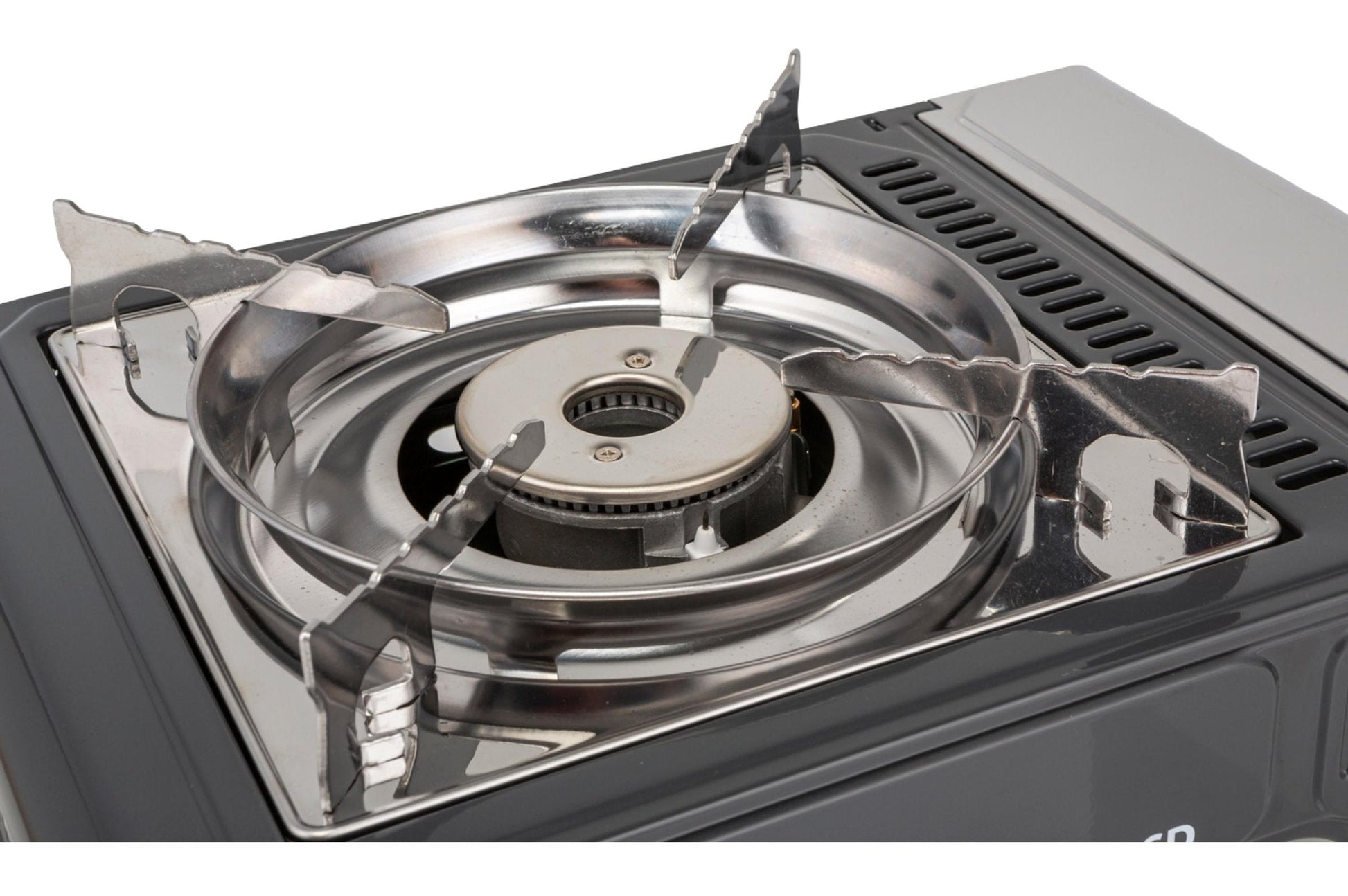 Unser hochwertiger tragbarer Gaskartuschenkocher bietet maximale Bequemlichkeit und Zuverlässigkeit für Ihre Outdoor-Kochbedürfnisse. Mit einem Flammen-Einstellknopf können Sie die Flamme individuell anpassen. Die integrierte Piezo-Zündung ermöglicht ein müheloses Anzünden, während das Zündsicherungs-Thermoelement zusätzliche Sicherheit bietet. Die Topfauflageplatte und die Kartuschenabdeckung bestehen aus langlebigem Edelstahl, der leicht zu pflegen ist und eine lange Lebensdauer garantiert. Der spezielle Zweiflammenbrenner gewährleistet eine optimale Leistungsabgabe. Das lackierte Metallgehäuse verleiht dem Kocher eine robuste Konstruktion, während der stabile Kunststoff-Transportkoffer für bequemen Transport und Aufbewahrung sorgt. Genießen Sie die Freude am Kochen im Freien mit unserem tragbaren Gaskartuschenkocher.
