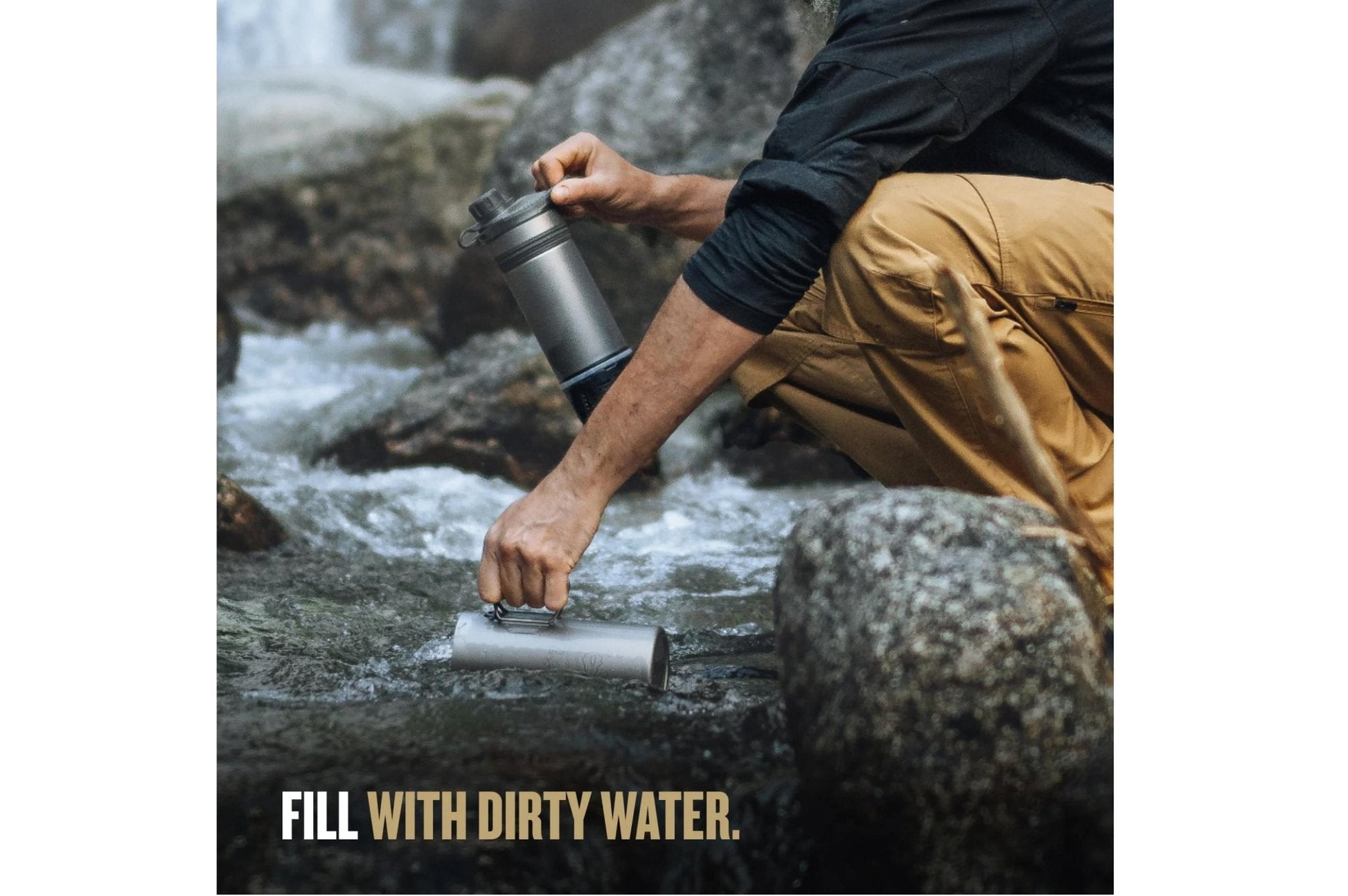 Die GeoPress® Ti ist das ultimative Werkzeug für Outdoor-Enthusiasten, Reisende und Survivalisten. Diese vielseitige 710 ml Flasche aus CP4 Grade 1 Titan vereint Wasserbehälter, Filter, Reiniger, Trinkgefäß und Kochgeschirr in einem kompakten Design.