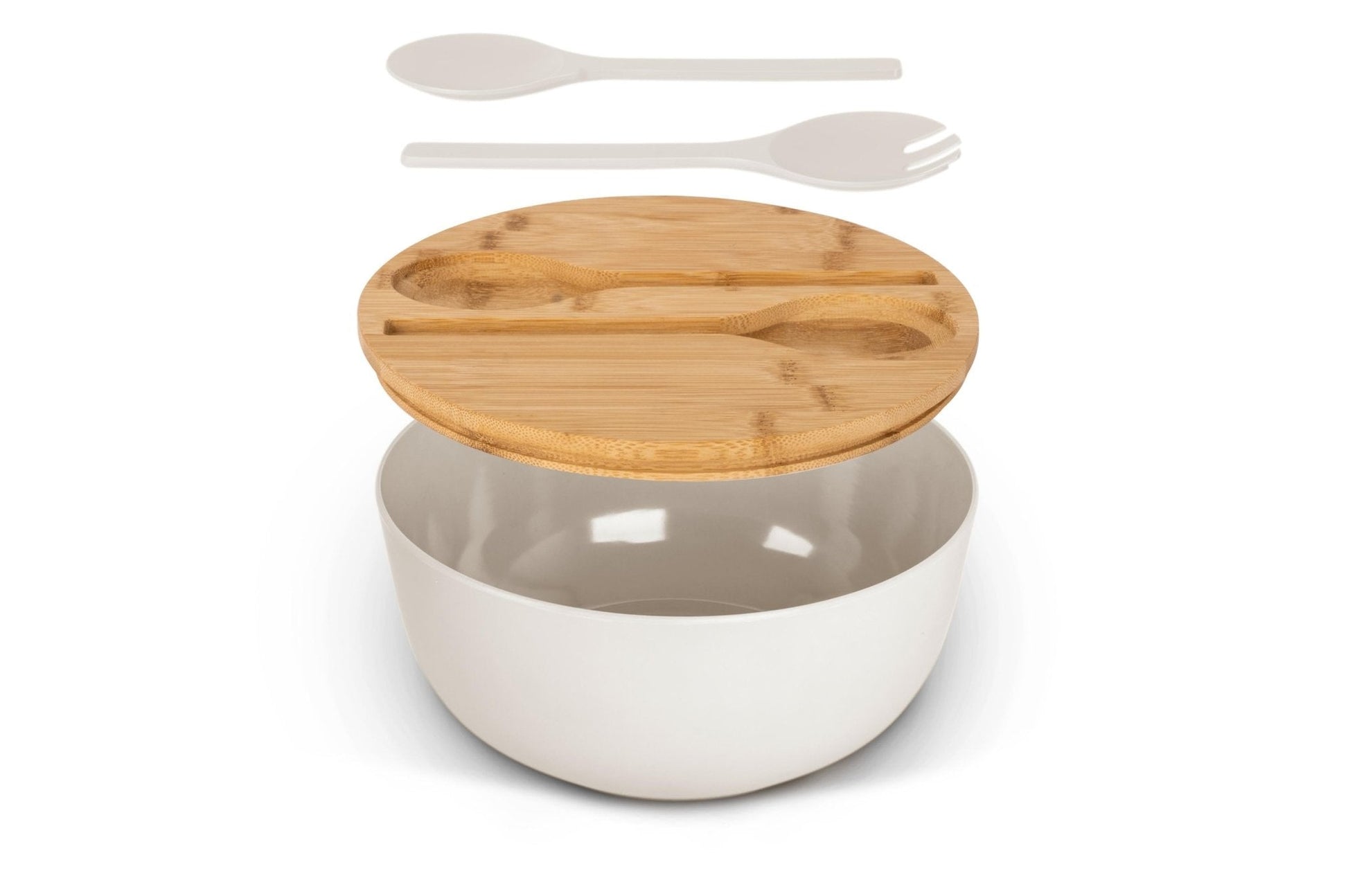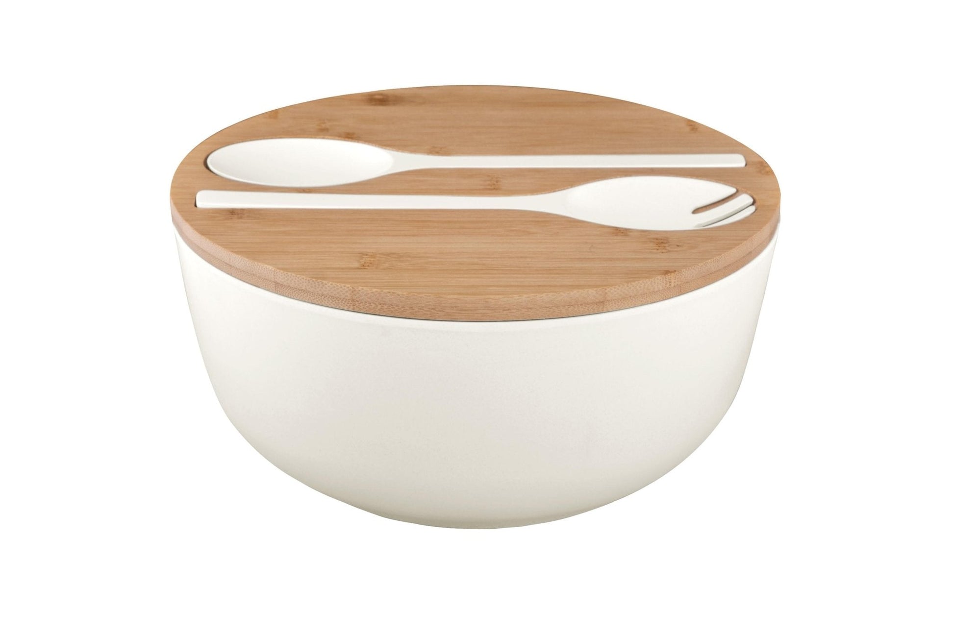 Die Brunner Salatschüssel Greenkick kombiniert Funktionalität und Stil. Mit einem Durchmesser von 25 cm besteht die Schüssel aus bruchfestem Melamin und ist damit besonders robust. Der echte Bambusdeckel dient nicht nur als Abdeckung, sondern kann auch als Schneidebrett genutzt werden. Das integrierte Salatbesteck ergänzt die praktische Ausstattung. Ein Anti-Rutsch-Ring am Boden sorgt für sicheren Halt. Ideal für jede Mahlzeit, drinnen wie draußen.