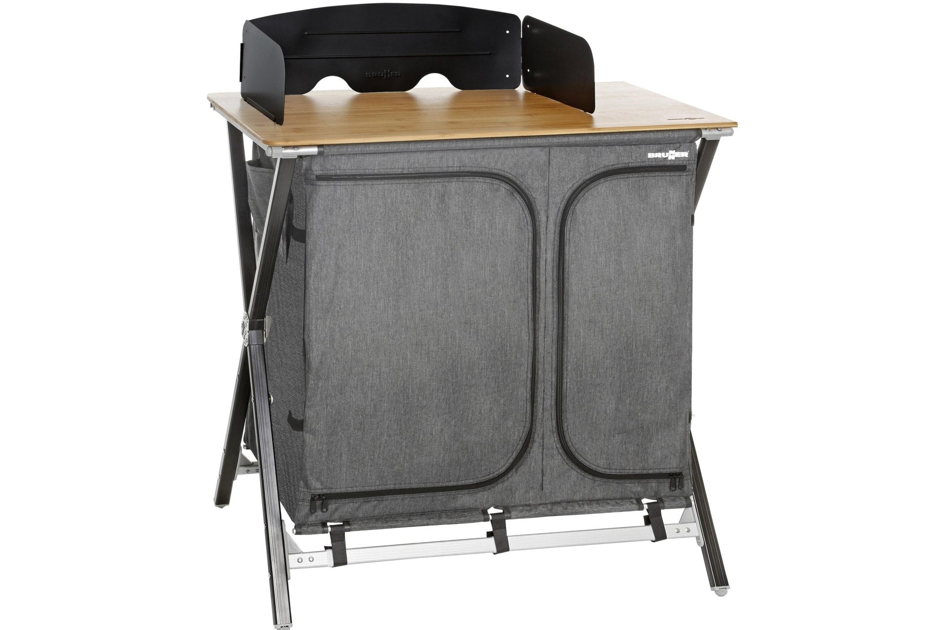 Entdecken Sie unsere praktische Küchenbox mit CROSS-Rahmen aus Alu-Rechteckprofil und zentralem Metallgelenk. Die höhenverstellbaren Füße sorgen für Stabilität auf jedem Untergrund. Mit zwei Innenablagen und einer Arbeitsfläche aus Bambusholz bietet sie reichlich Stauraum und Arbeitsfläche. Das Mountless-System ermöglicht eine einfache Handhabung. Inklusive Windschutz für Gaskocher und praktischer Tragetasche für einfachen Transport. Die faltbare Konstruktion macht sie zum idealen Begleiter für Ihre Outdoor-Abenteuer.