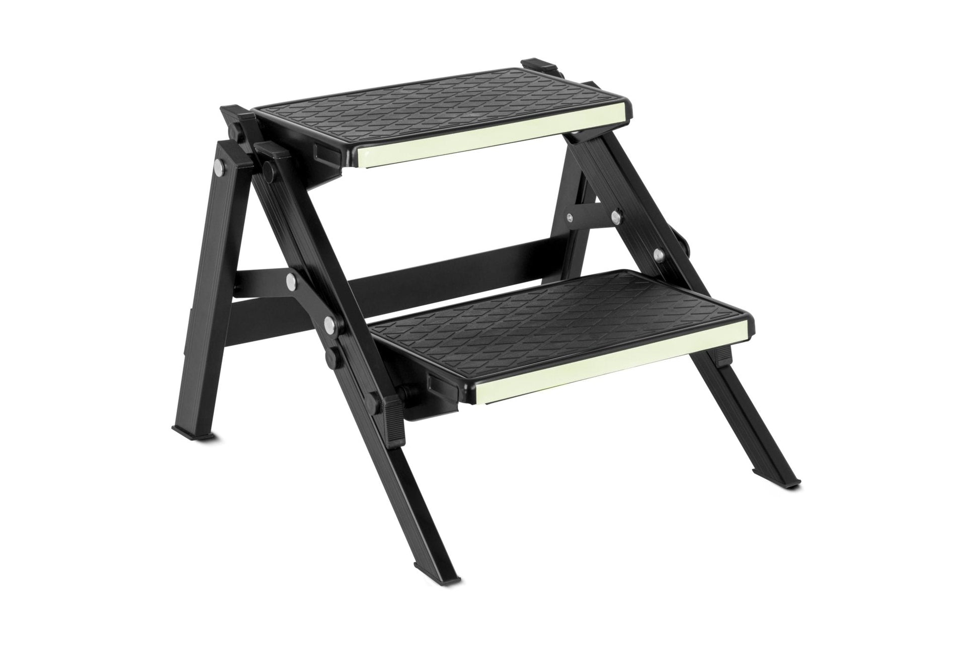 Die doppelt klappbare Trittstufe für Wohnmobile mit schwarzer Pulverbeschichtung und fluoreszierenden Sicherheitsstreifen wurde entwickelt, um besonders robust und gleichzeitig äußerst praktisch für all Ihre Reisen zu sein. Dank ihres klappbaren und platzsparenden Designs und der fluoreszierenden Sicherheitsstreifen müssen Sie sich keine Sorgen mehr machen, im Dunkeln zu laufen oder über eine Stufe zu stolpern. In wenigen Sekunden einsatzbereit, bietet diese Trittstufe nicht nur eine ideale Lösung für Wohnmobile, sondern eignet sich auch hervorragend als Tritt, um an schwer erreichbare Stellen zu gelangen.