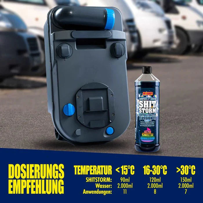 Der SHIT STORM zersetzt Fäkalien und Toilettenpapier zu einer homogenen Flüssigkeit. Er überdeckt Toiletten-Gerüche und maskiert zuverlässig und effektiv mit dunklem Farbstoff. Biologisch abbaubar.