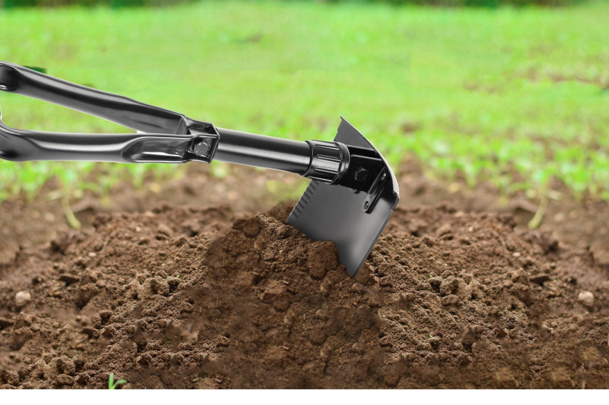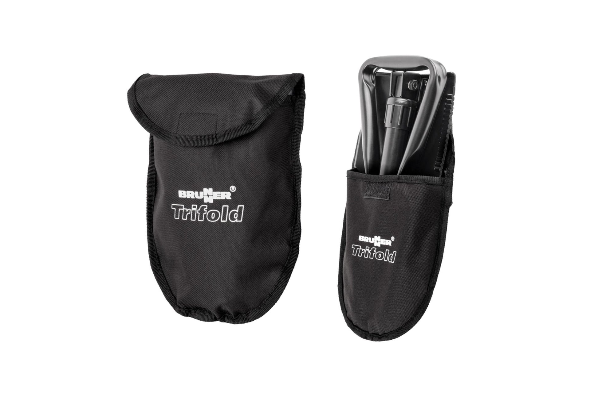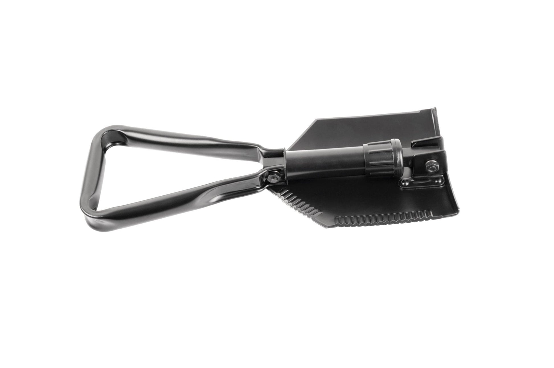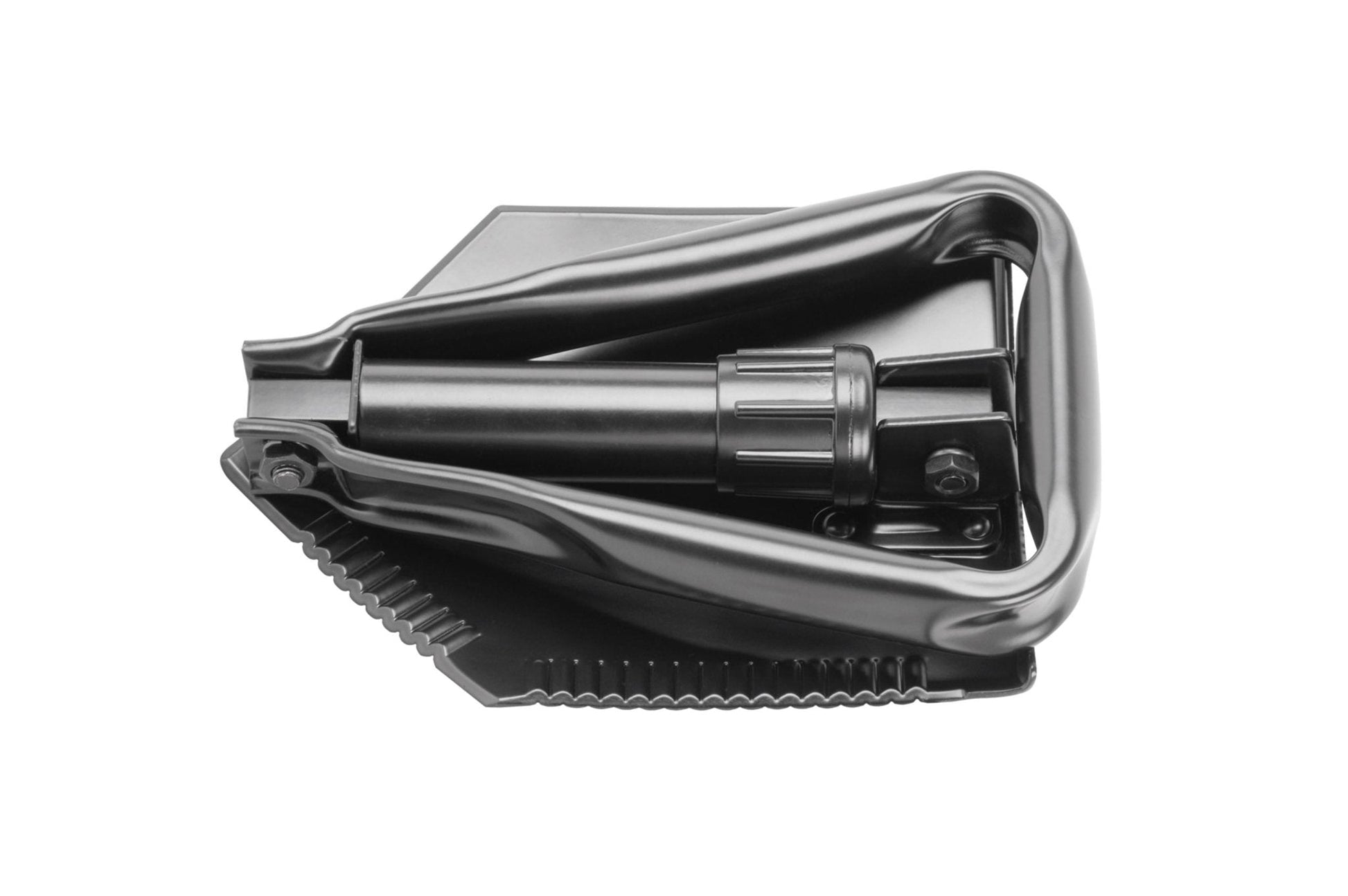 Klappbare Schaufel/Hacke aus geschmiedeten Metall. Mit gezacktem Blatt und rohrförmigem Stiel, der durch einen integrierten Stift verriegelt wird. Komplett mit Tasche.