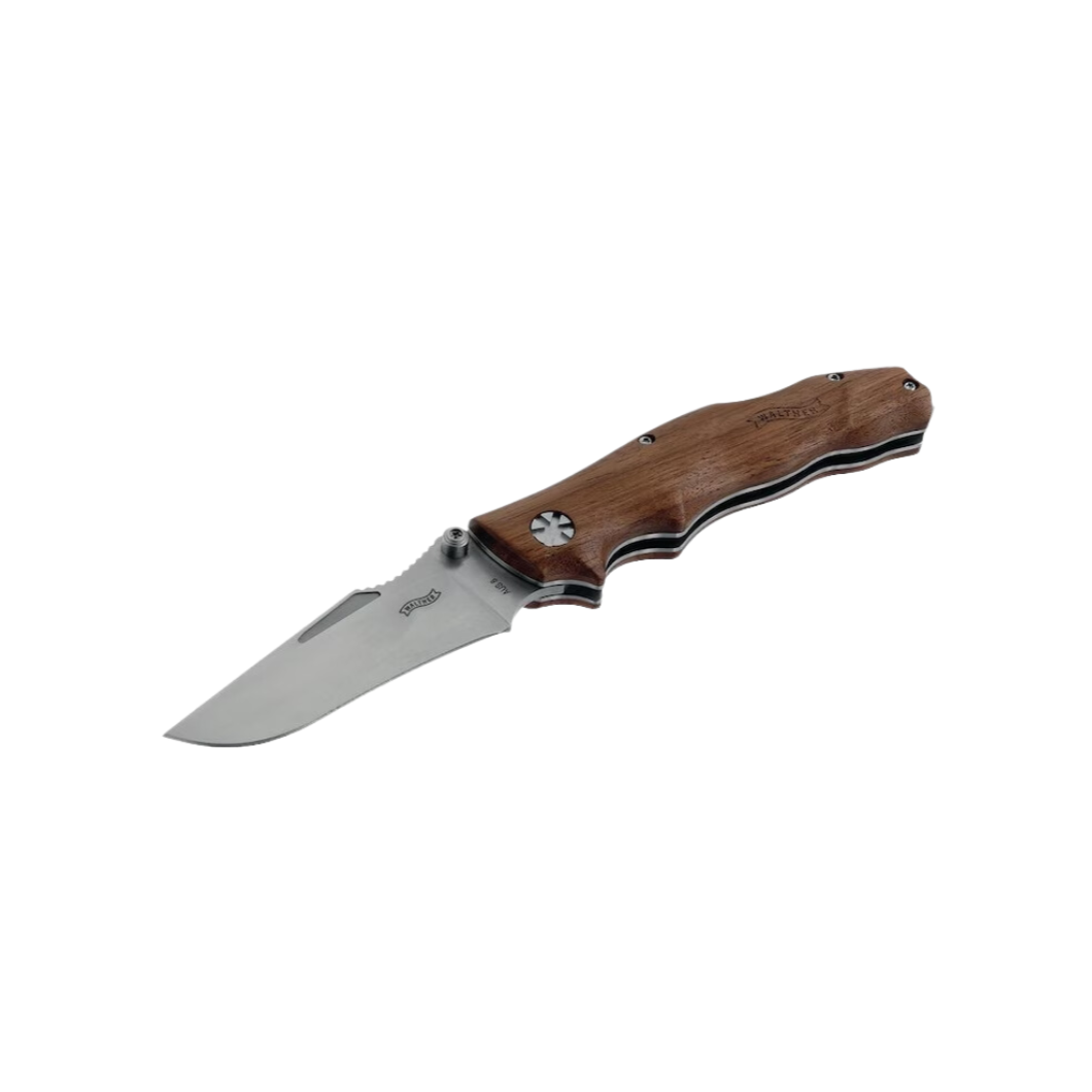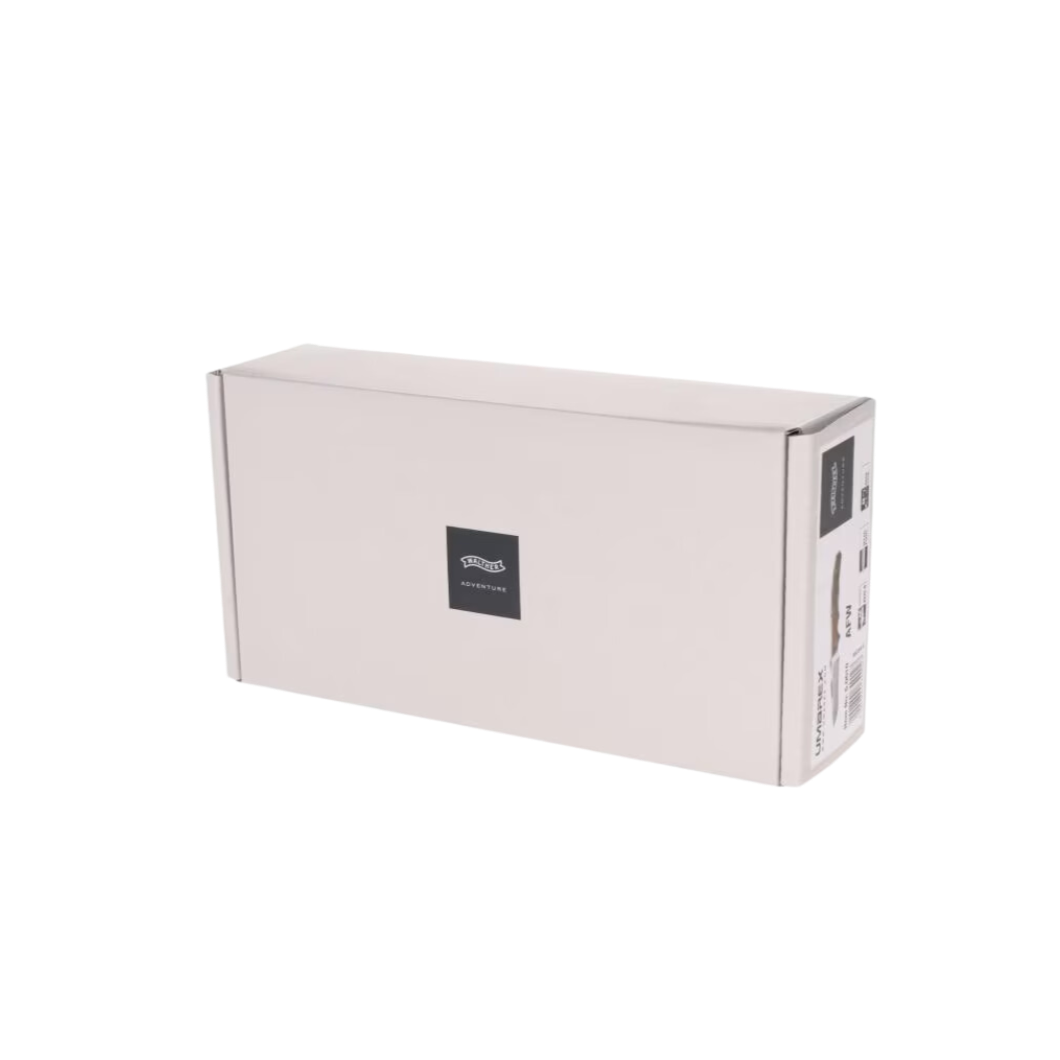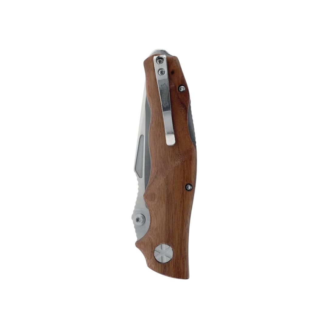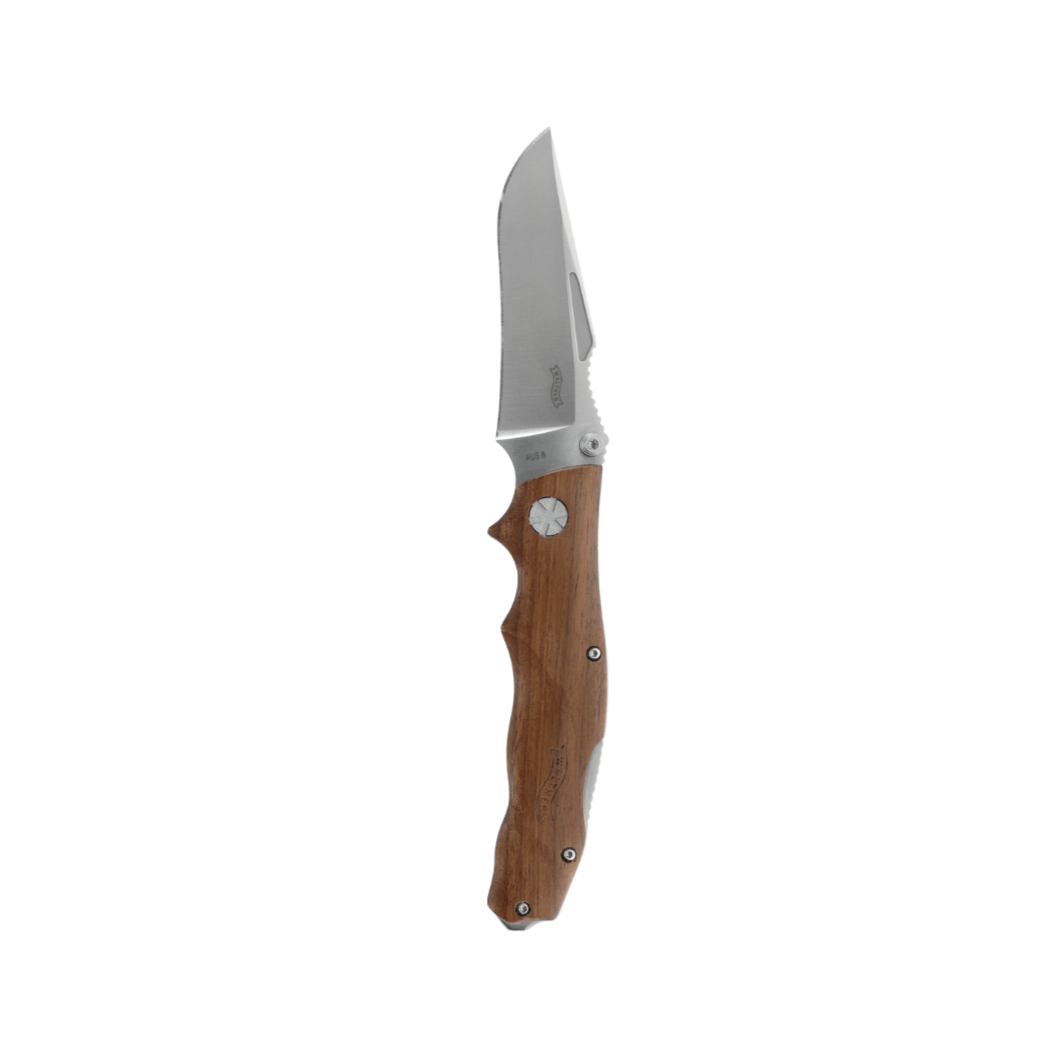 The AFW 3 knife is the medium-sized version of the elegantly designed AFW Adventure Folder Wood knife. It is perfect for the adventurer and has the highest demands on materials and reliability. The AFW 3 offers an optimized compromise between handiness and versatility. It is an absolute eye-catcher, because the satin finish of the spearpoint blade made of high-quality AUS steel harmonizes perfectly with the matte, ergonomically shaped walnut wood handle. The AFW 3 has a solid backlock, a removable blade lifter and a removable clip. In the leather holster provided, it can always be carried on your belt in style and safely.