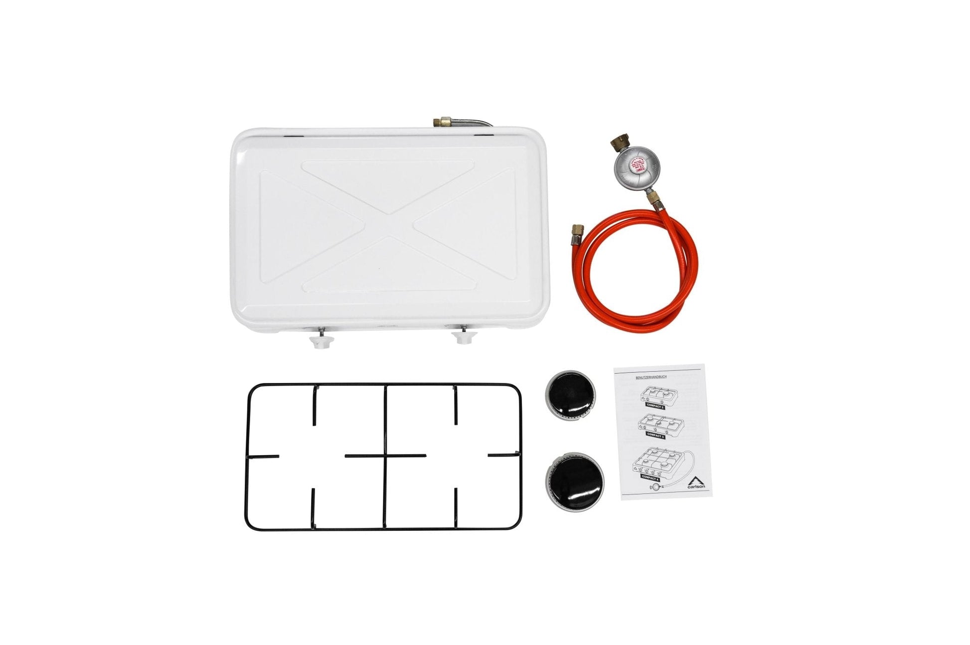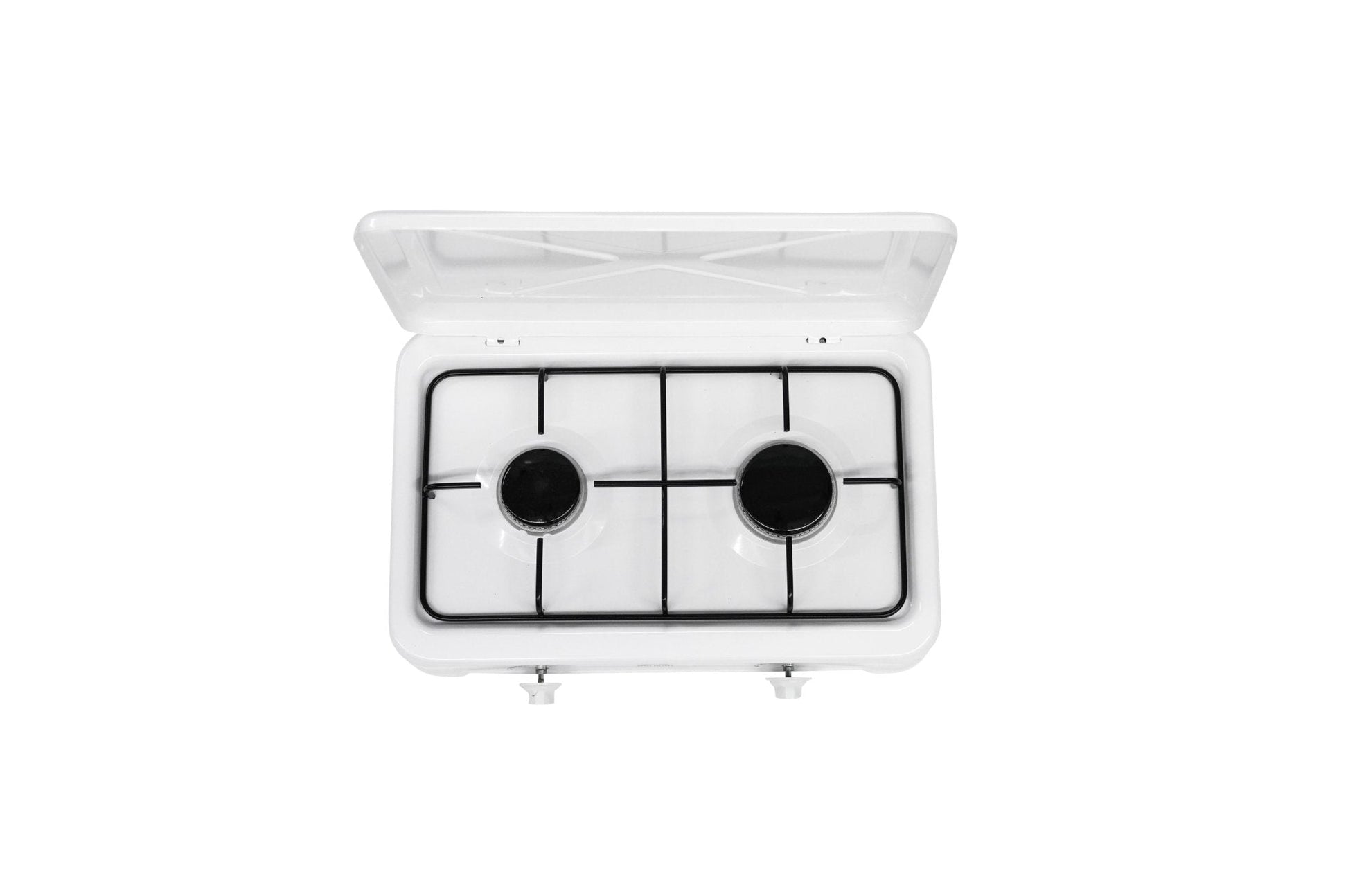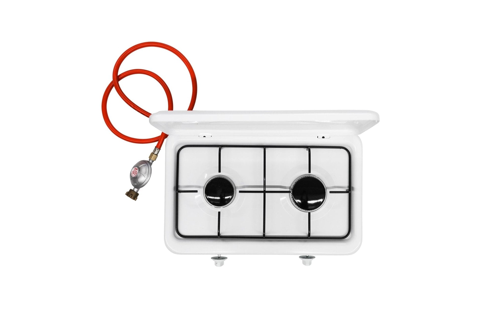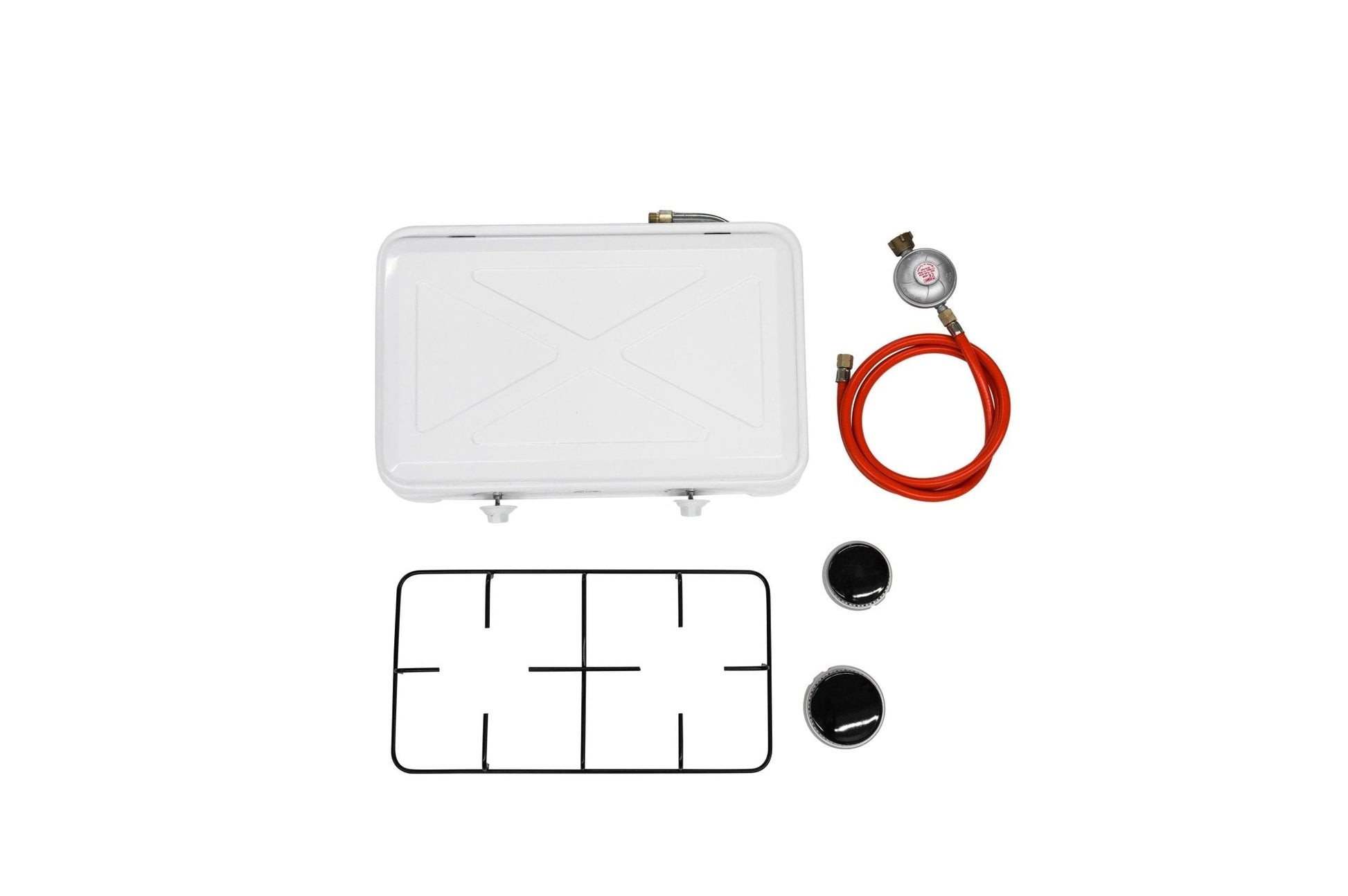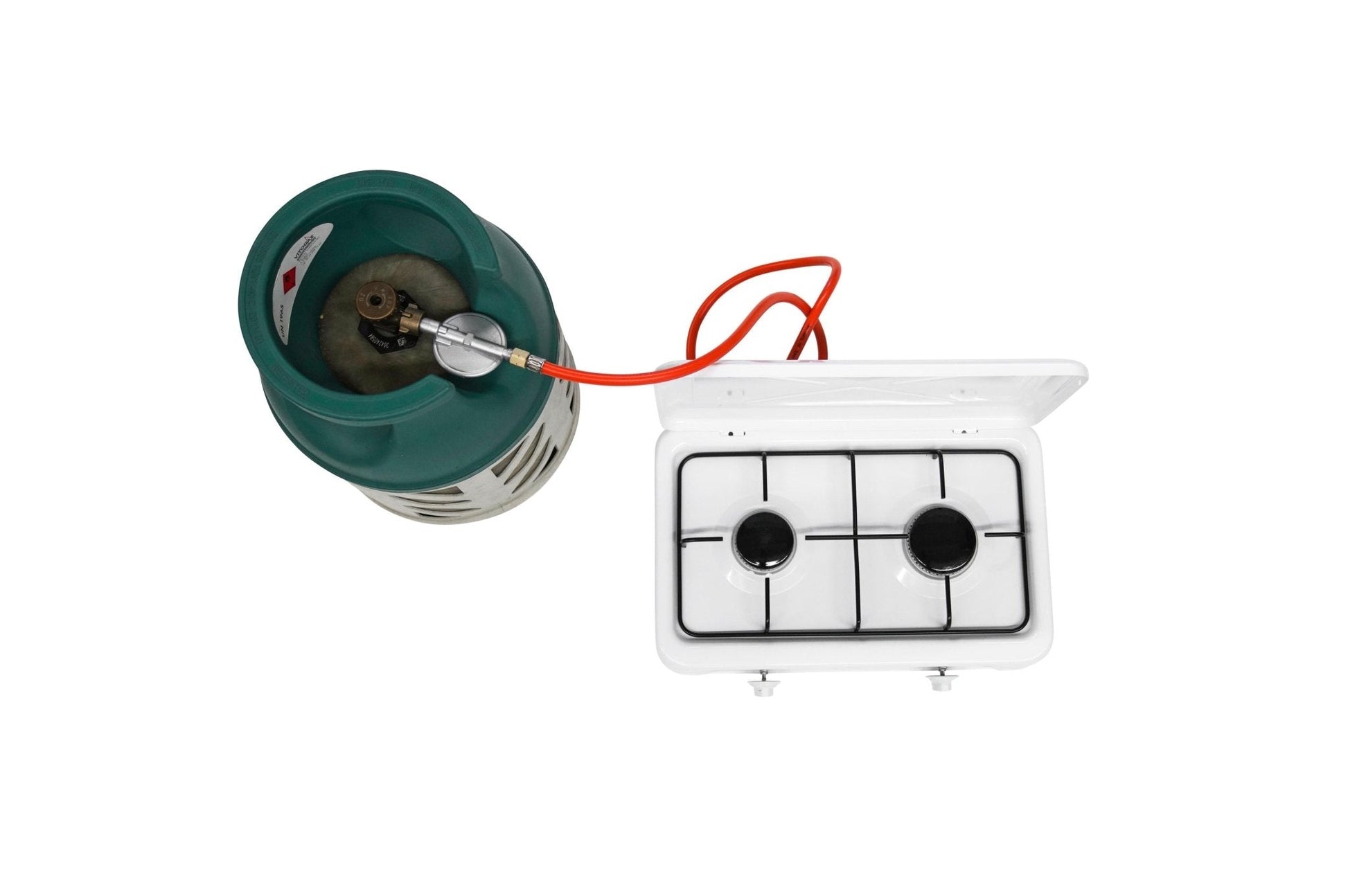 Kompakter Zweiflammen Gaskocher aus pulverisiertem Aluminium Gehäuse. Stufenlos verstellbare Flammenregler. Der Topfrost kann entfernt werden für die Reinigung des Gaskochers. Der aufklappbare Deckel dient zugleich als Windschutz beim kochen, dadurch kann der Gasverbrauch deutlich reduziert werden. Der Gaskocher kommt mit 1 1/4 Zoll Anschluss inklusive Gasschlauch und 29 m/Bar Druckregler.