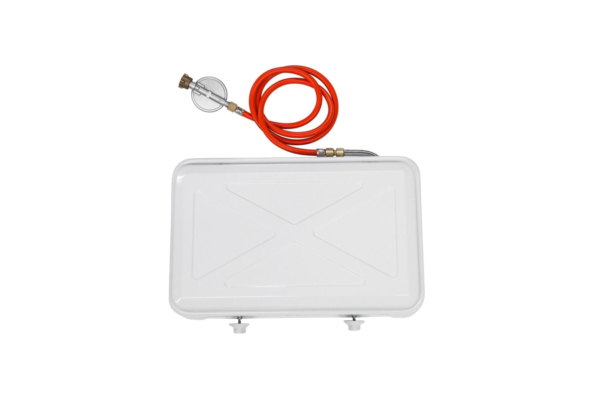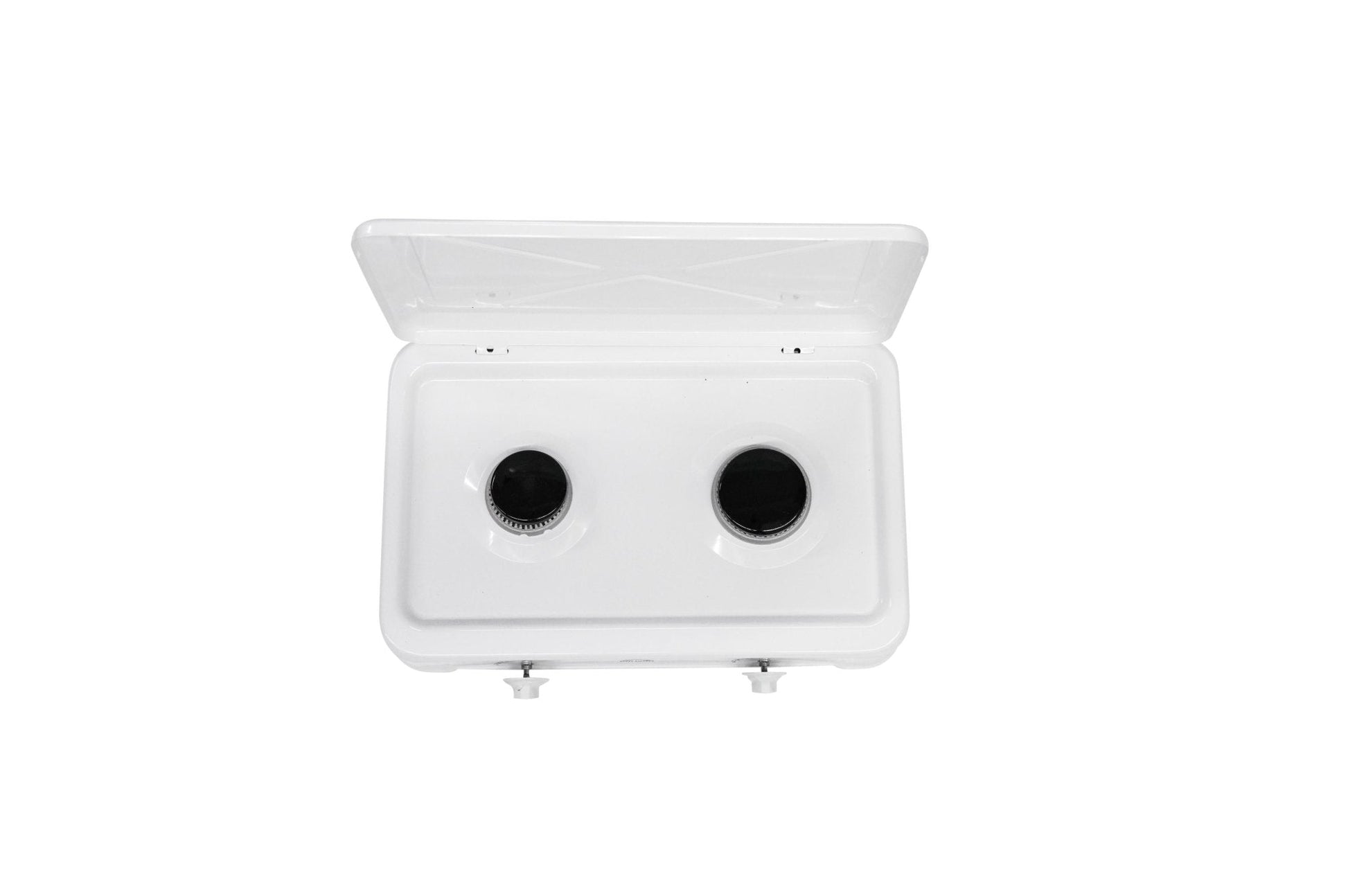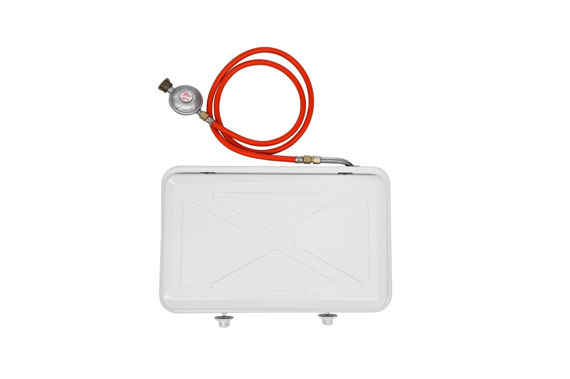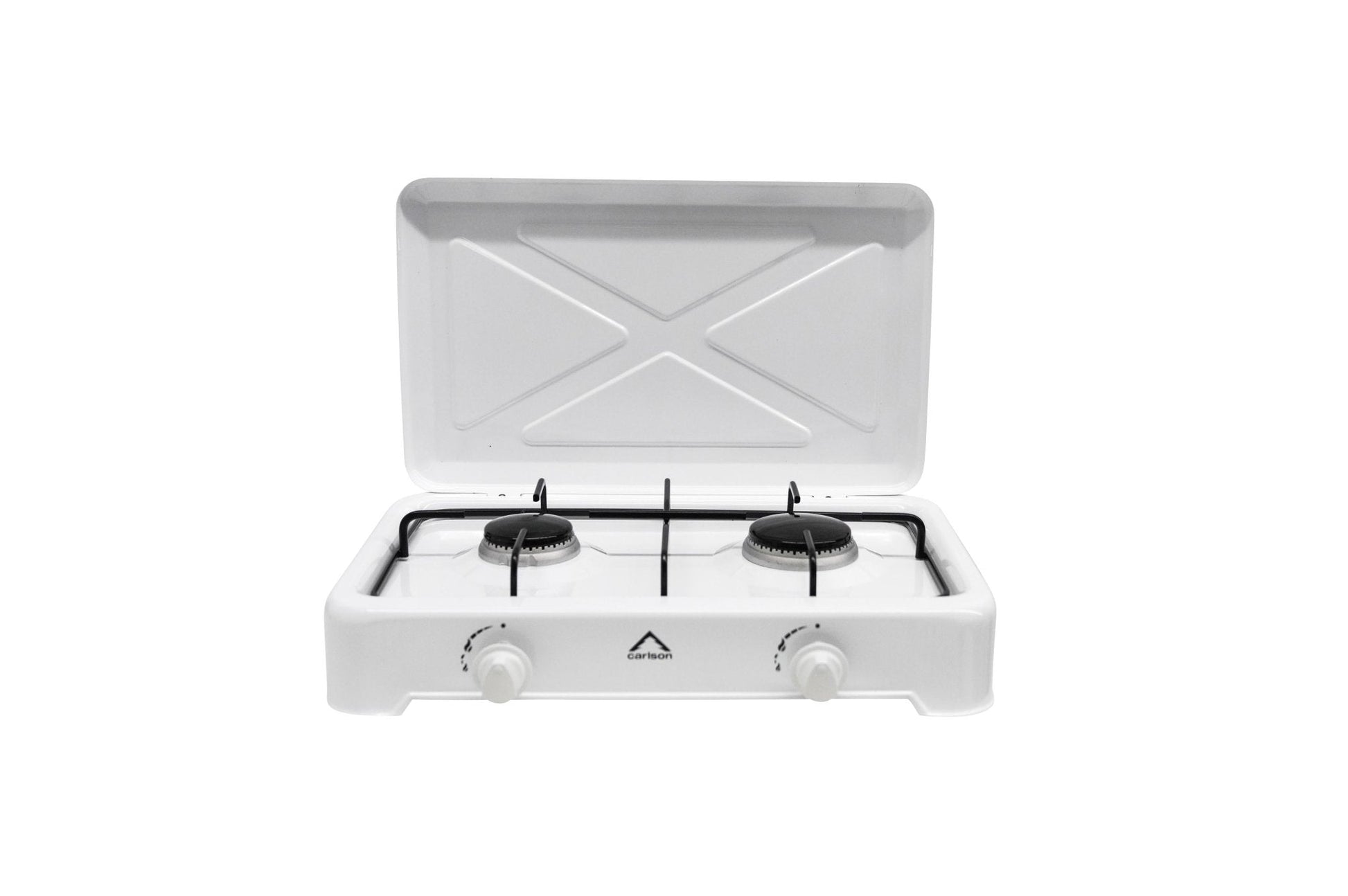 Kompakter Zweiflammen Gaskocher aus pulverisiertem Aluminium Gehäuse. Stufenlos verstellbare Flammenregler. Der Topfrost kann entfernt werden für die Reinigung des Gaskochers. Der aufklappbare Deckel dient zugleich als Windschutz beim kochen, dadurch kann der Gasverbrauch deutlich reduziert werden. Der Gaskocher kommt mit 1 1/4 Zoll Anschluss inklusive Gasschlauch und 29 m/Bar Druckregler.