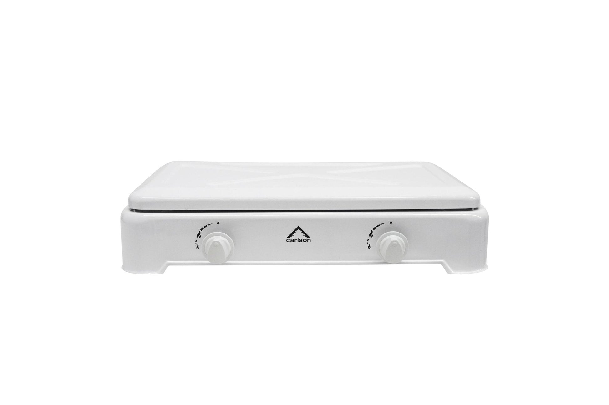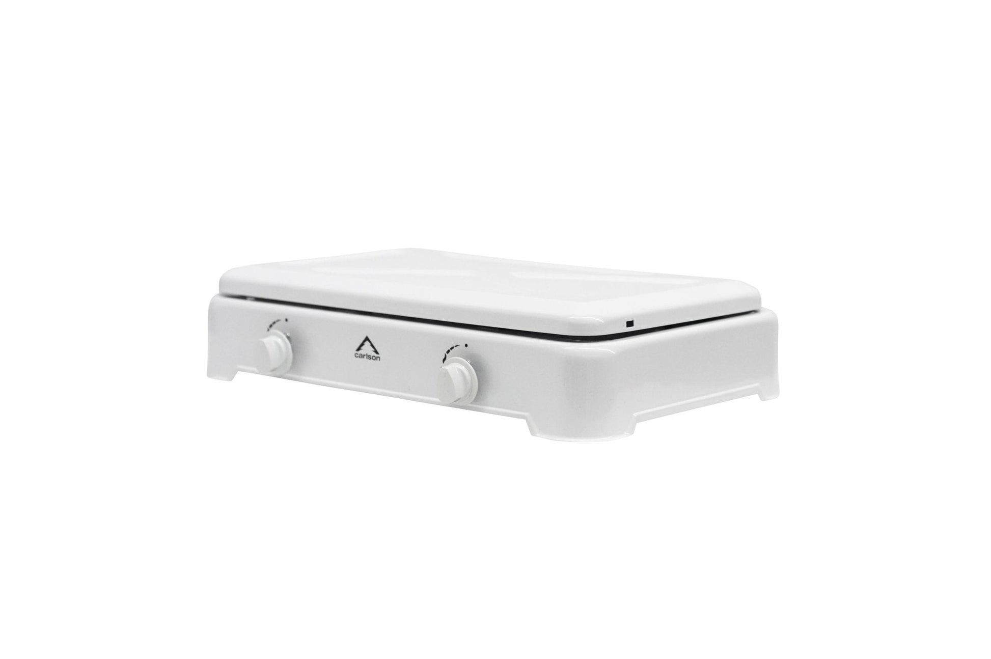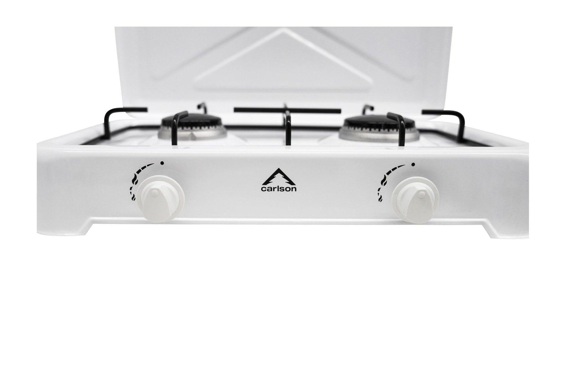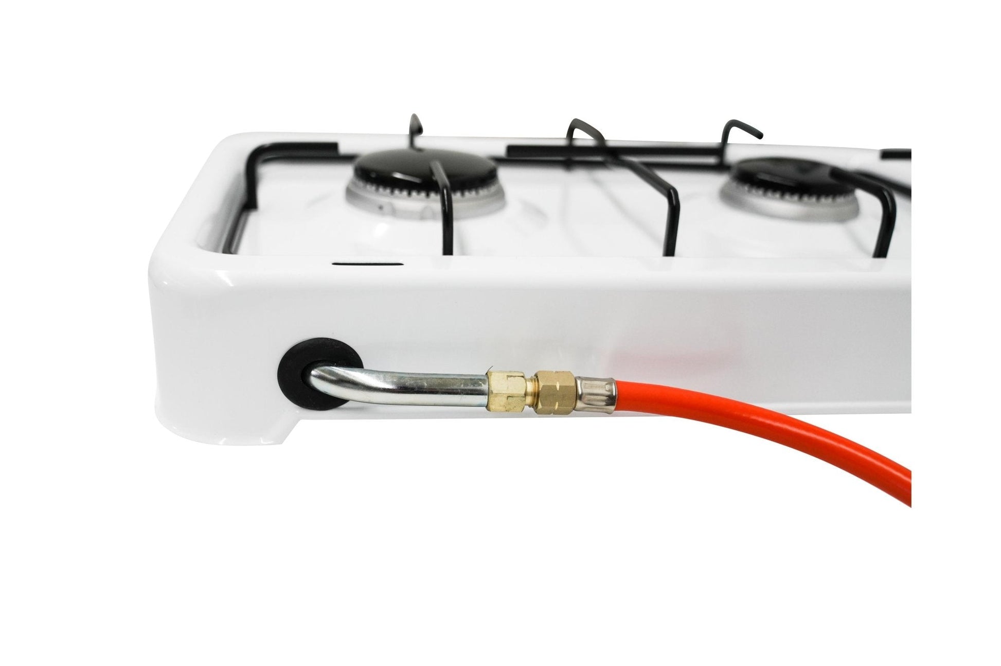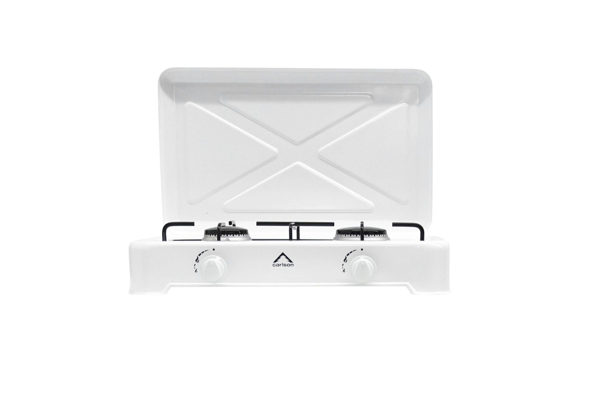 Kompakter Zweiflammen Gaskocher aus pulverisiertem Aluminium Gehäuse. Stufenlos verstellbare Flammenregler. Der Topfrost kann entfernt werden für die Reinigung des Gaskochers. Der aufklappbare Deckel dient zugleich als Windschutz beim kochen, dadurch kann der Gasverbrauch deutlich reduziert werden. Der Gaskocher kommt mit 1 1/4 Zoll Anschluss inklusive Gasschlauch und 29 m/Bar Druckregler.