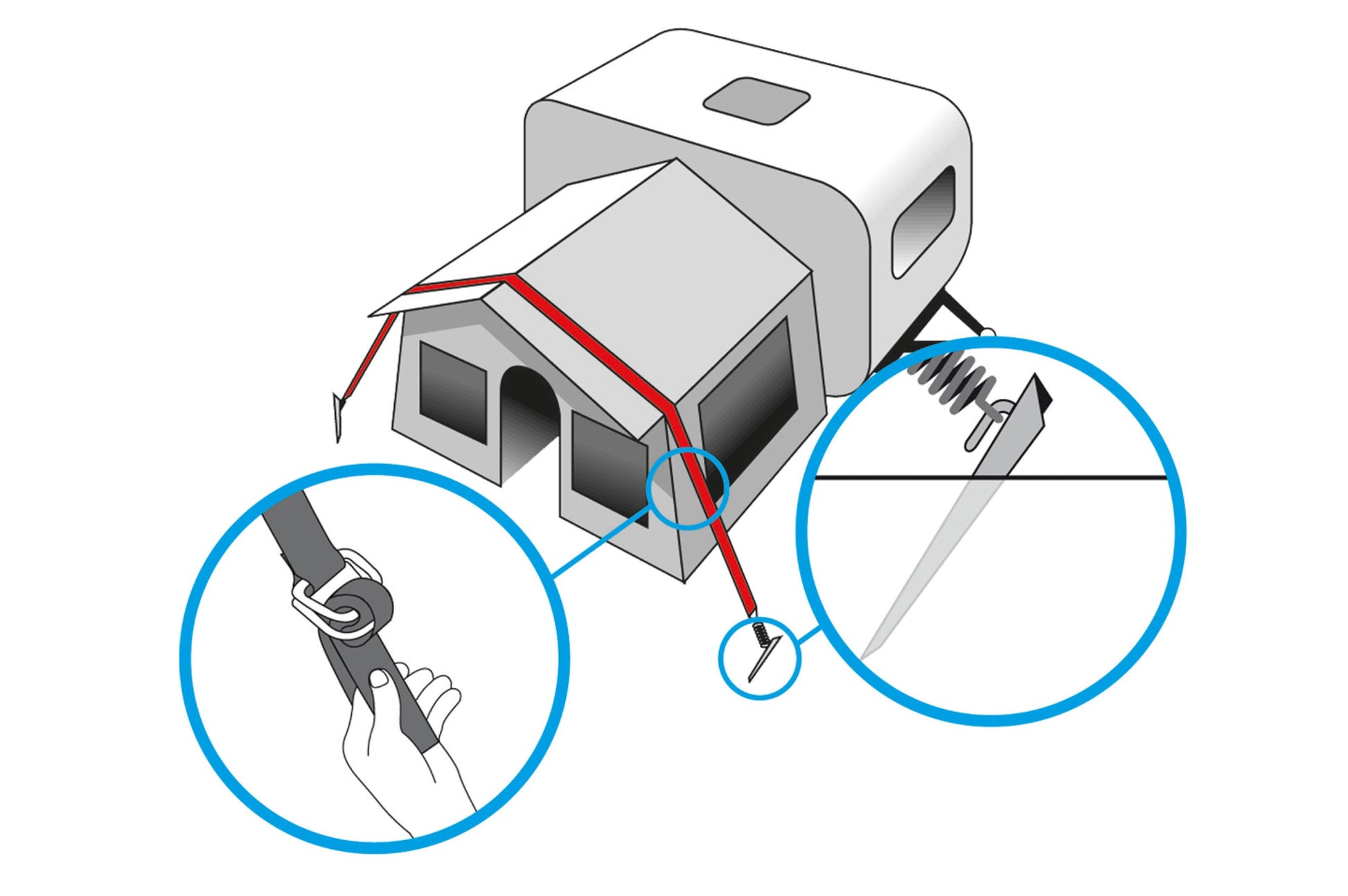 Dachhalteband zur Stabilisierung von Markisen und Vorzelten. Das Set besteht aus einem Stabilisierungsband (13 Meter) samt Spannfeder und großen Befestigungsheringen.