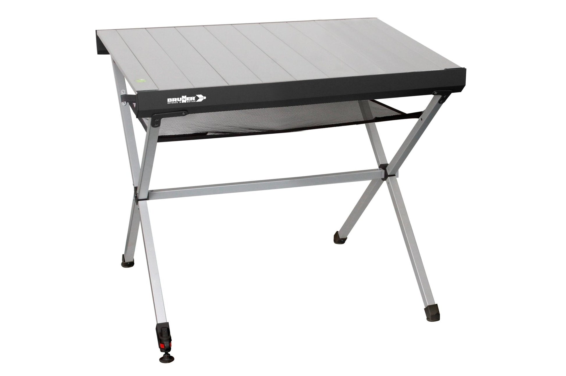Der patentierte Aluminiumtisch vereint durchdachtes Design mit maximaler Funktionalität: Die silber eloxierte Rolltischplatte mit lückenlosem Gapless-System sorgt für eine glatte Oberfläche, während der stabile Klapprahmen aus Aluminium-Vierkantrohren und die zentrale Stabilisierungsstange für höchste Standfestigkeit garantieren. Dank integrierter Wasserwaage, höhenverstellbarem Bein und praktischer Netzablage ist der Tisch ideal für Camping, Outdoor-Einsätze oder den flexiblen Einsatz unterwegs. In der Transporttasche mit zwei separaten Fächern lässt sich alles bequem und sicher verstauen.
