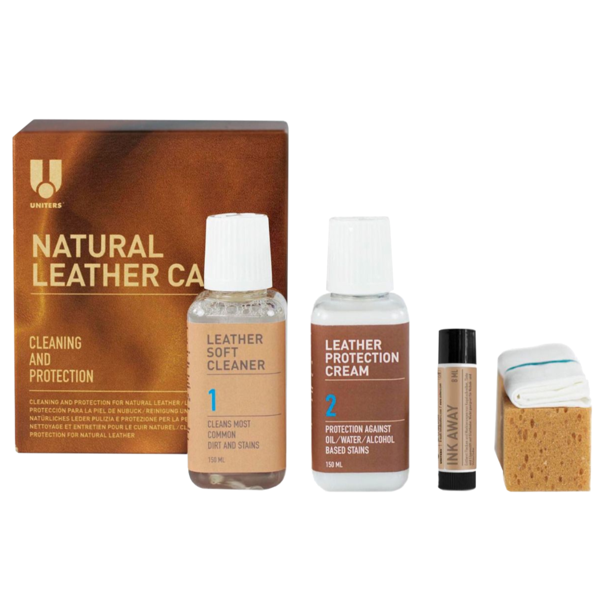 Das Set besteht aus Leather Soft Cleaner, Leather Protection Cream und Ink Away.
